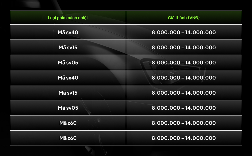 Chi phí dán phim cách nhiệt hiện nay thường dao động từ 8 – 25 triệu đồng, cụ thể bạn có thể tham khảo bảng báo giá sau đây: